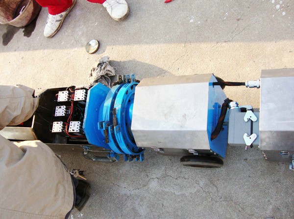 400補口機屬于空心工件內表面噴涂液體及預處理設備。由驅動、行走、除銹、吸塵、噴涂、監控和電源七部分組成。機體為三節,用鉸軸球頭組件聯接成一體。后部有行走電機驅動主動輪,五對從動輪安裝在中部和前部。除銹部分由一個電機帶動旋轉架旋轉,旋轉架上安裝三個小電機帶動鋼刷旋轉除銹。用吸塵器吸收銹塵。噴涂電機帶動旋杯高速旋轉,把液體涂料甩噴到焊口區域。能在直徑700~1000毫米管道內深達1公里以上自進自出。用無線遙控和視頻圖像直觀,完成焊口定位、除銹、吸塵、噴涂全過程焊口補口作業。自動化程度和工效高,補口質量好,為國內管道施工提供了一種機、電、訊一體化自主創新設備,具有推廣應用價值。