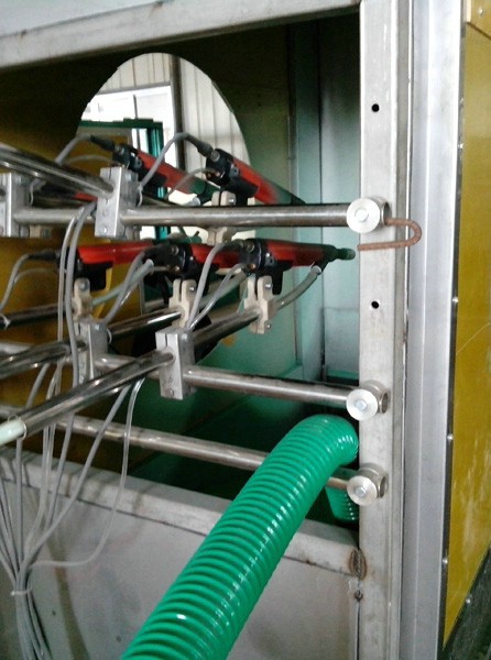 靜電外噴粉是以具有霧化咀(使涂料霧化)和放電級(發(fā)生電量電流)的涂裝機使涂料微粒化,對之施加電荷,在電極與被涂物體之間形成電場,利用其靜電吸附作用而涂裝。