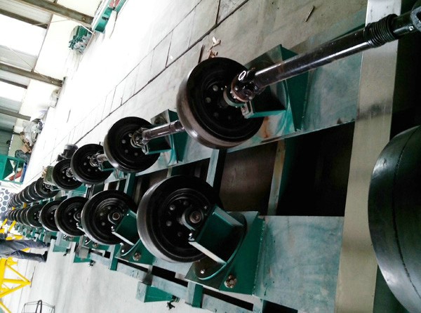傳動線解決中大型管道進行內、外防腐作業時管子的進給問題。它包括主動輪組件、從動輪組件、回轉盤、滑座、中心距調節機構、中心距鎖止機構、螺旋角調節機構和螺旋角鎖止機構,所述主動輪組件和從動輪組件分別固定在對應的回轉盤上,所述回轉盤安裝在滑座上,所述滑座與中心距調節機構及中心距鎖止機構配裝,所述螺旋角調節機構與回轉盤配裝,所述螺旋角鎖止機構安裝在滑座上,它與螺旋角調節機構匹配。本實用新型不僅可降低操作人員的勞動強度、提高工作效率,而且能保證管道螺旋傳動線上各輪組之間參數的一致性。
